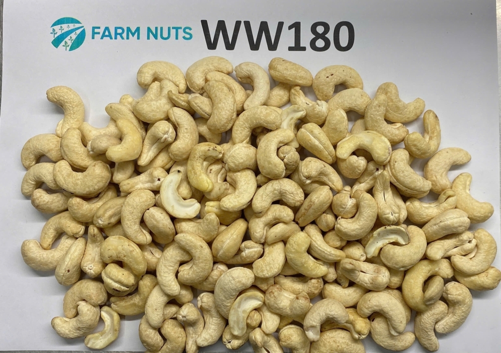 W180 stands for "White Whole" cashews, with approximately 140 to 180 kernels per pound (265–395 kernels per kilogram). This grade is known internationally as the "King of Cashew" due to its large size and premium quality.